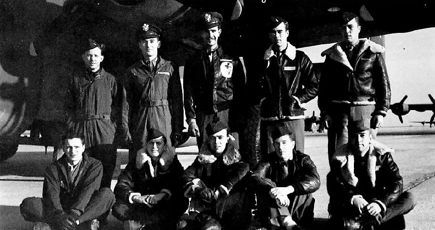 Kneeling L-R: Nicholas C. Belik (G); James E. Waggle, Jr. (E); Ralph C. Finch (G); Harold A. Straughan (G); Charles N. Fry (G). (Martin's crew consisted of four officers. The enlisted men in front row were all members of the Model Crew, McKenna's Crew.)